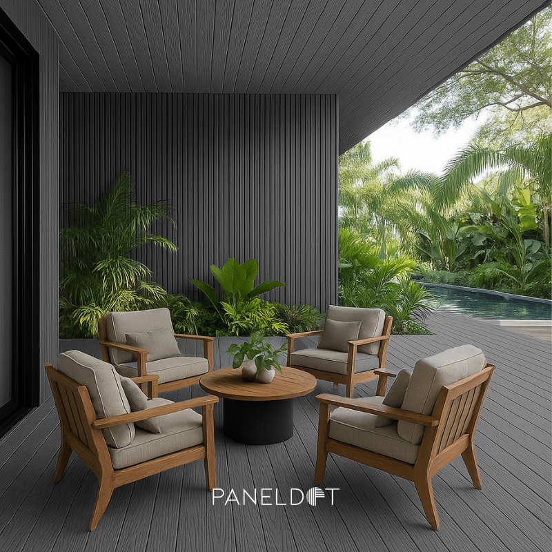 Material: WPC (Wood Plastic Composite) — madera 50%, polímeros de plástico reciclados 40%, otros 10%.