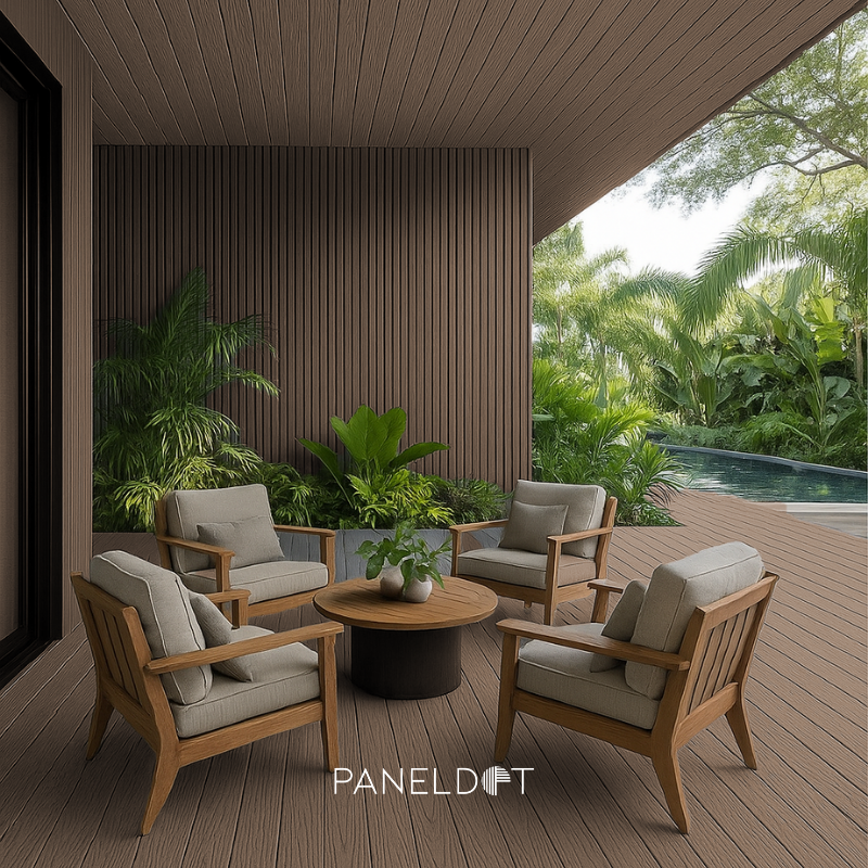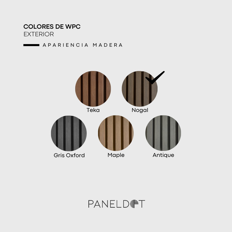 Material: WPC (Wood Plastic Composite) — madera 50%, polímeros de plástico reciclados 40%, otros 10%.