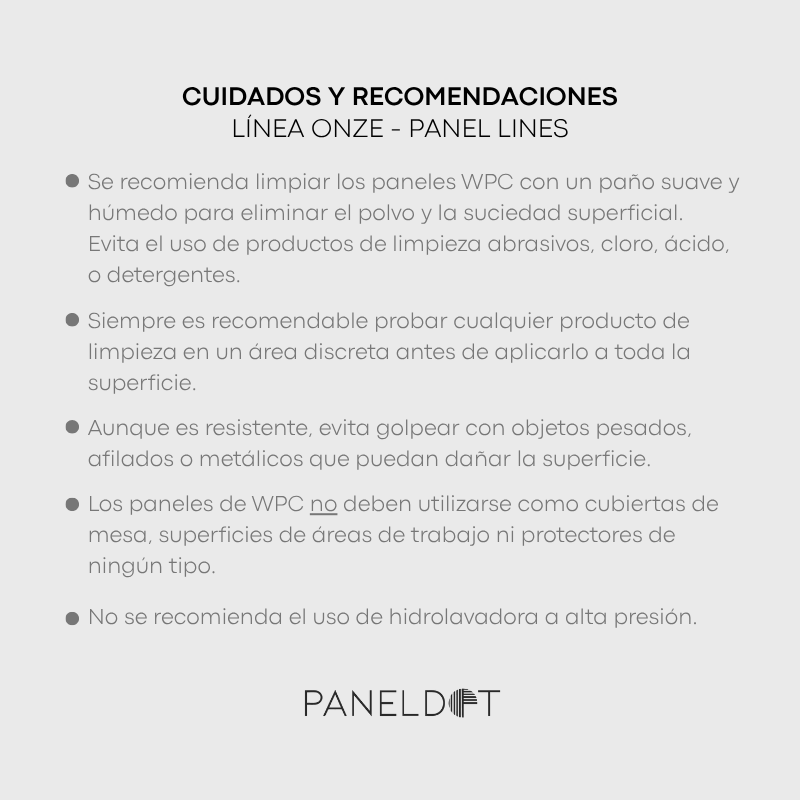 La Línea Onze combina paneles Flat (lisos) y Lines (tirilla) en colores y texturas coordinadas, permitiendo mezclas entre modelos para crear composiciones únicas en cada muro. Su sistema se complementa con perfiles metálicos en negro y oro suave, ideales para uniones, entrecalles y terminaciones de alto diseño.
