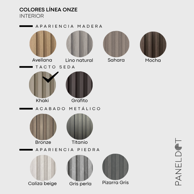 La Línea Onze combina paneles Flat (lisos) y Lines (tirilla) en colores y texturas coordinadas, permitiendo mezclas entre modelos para crear composiciones únicas en cada muro. Su sistema se complementa con perfiles metálicos en negro y oro suave, ideales para uniones, entrecalles y terminaciones de alto diseño.