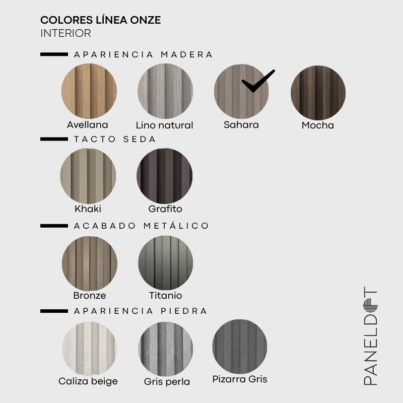 La Línea Onze combina paneles Flat (lisos) y Lines (tirilla) en colores y texturas coordinadas, permitiendo mezclas entre modelos para crear composiciones únicas en cada muro. Su sistema se complementa con perfiles metálicos en negro y oro suave, ideales para uniones, entrecalles y terminaciones de alto diseño.